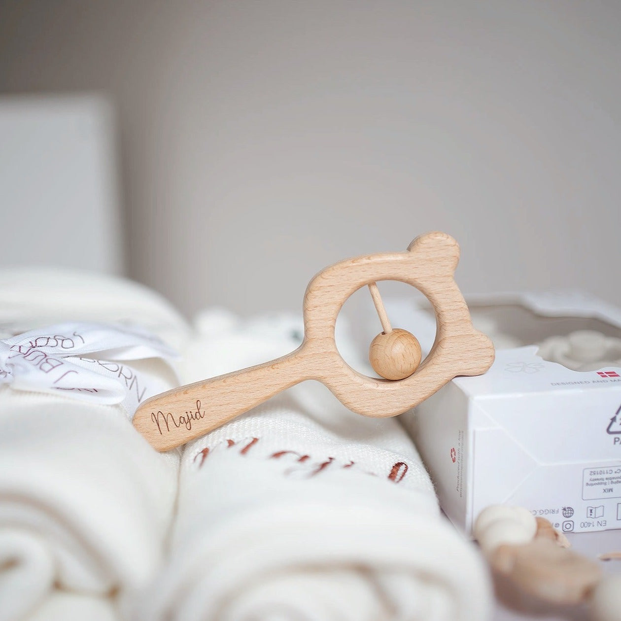 خشخشة من خشب الزان محفورة باسم الطفل أو الأحرف الأولى