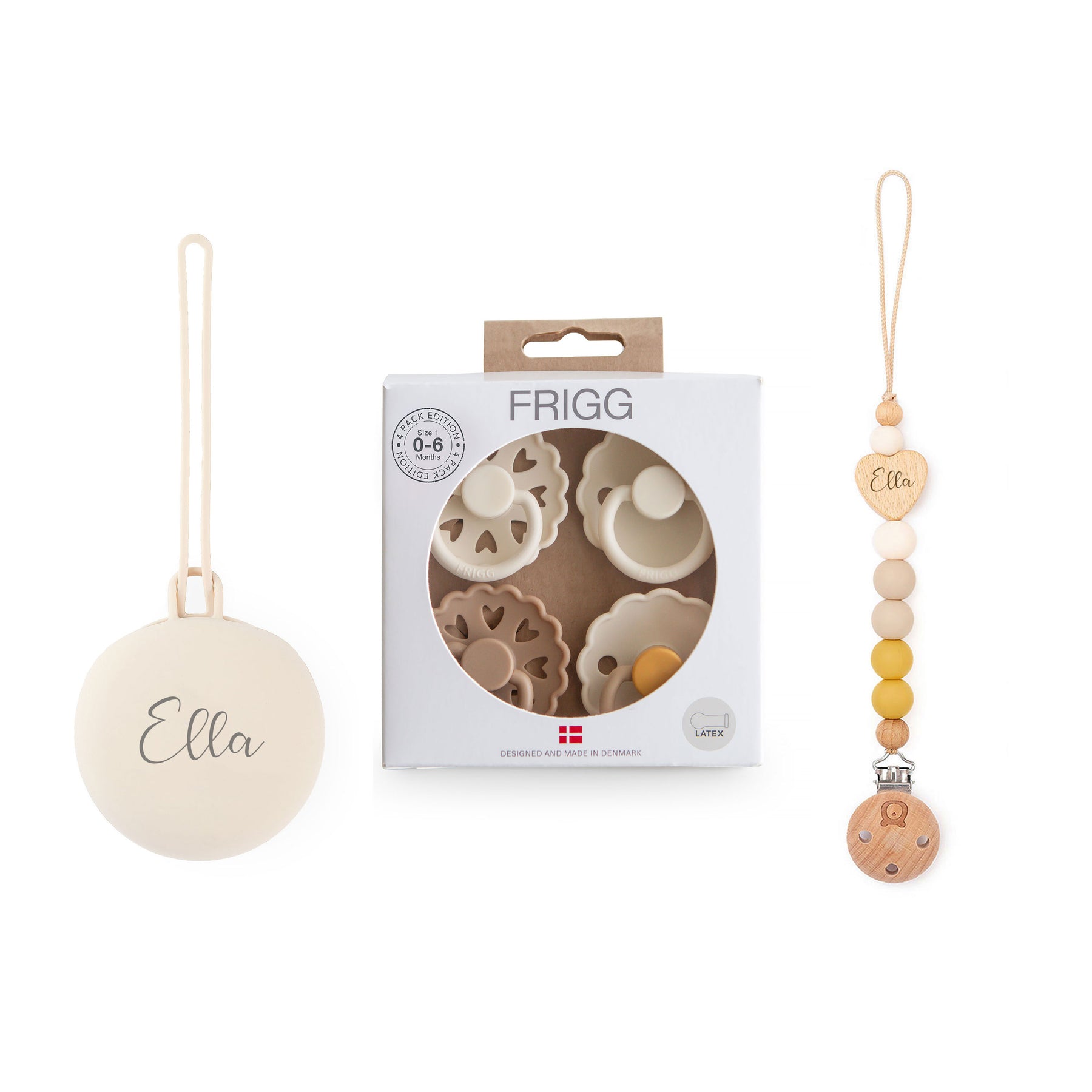 Set of 4 Frigg pacifiers in Size 1 (0-6 Months) or Size 2 (6-18 Months)