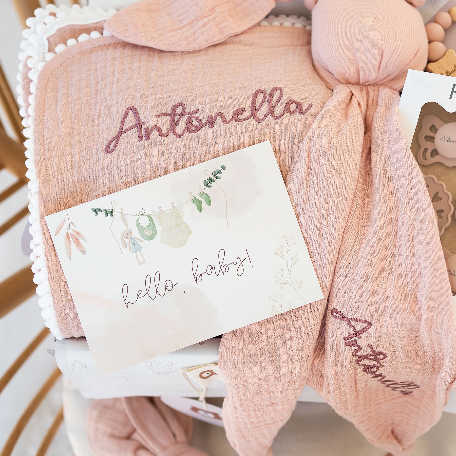 This matching set combines everyday essentials with personalised details, making it both practical and meaningful. From gentle swaddling to soothing teething moments and cosy cuddles, each piece is designed with your baby’s comfort in mind.