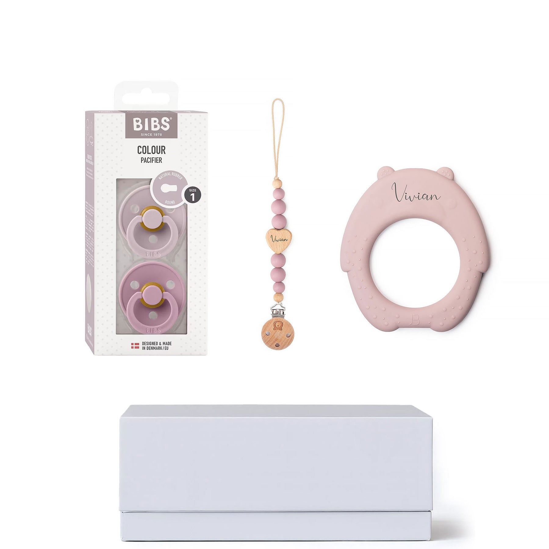 Add a personal touch to your gift by having the teether and pacifier clip laser engraved with your baby's name. This extra detail will make your gift even more special and unique.